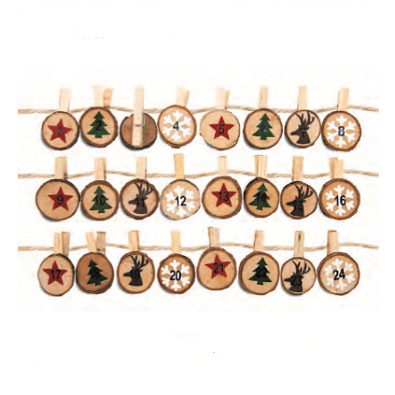 Adventskalenderzahlen gemalt auf Holzscheiben mit Seil, Größe: ca. 5 cm (Astscheiben sind ein Naturprodukt - es kann daher zu kleinen Abweichungen kommen), 1 Set mit 24 Klammern/Holzscheiben + Schnur