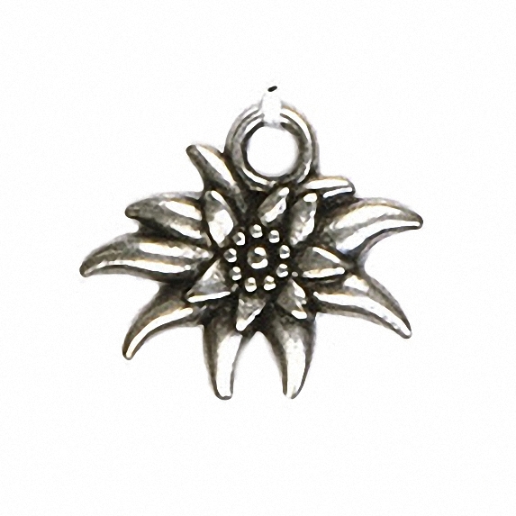 Dieser hübsche Anhänger als Edelweiß in silber ist ideal als Kettenanhänger, Ohrring oder als Charivarianhänger am Dirndl oder Tasche. Die Trachtenanhänger sind nickelfrei und haben eine Öse.