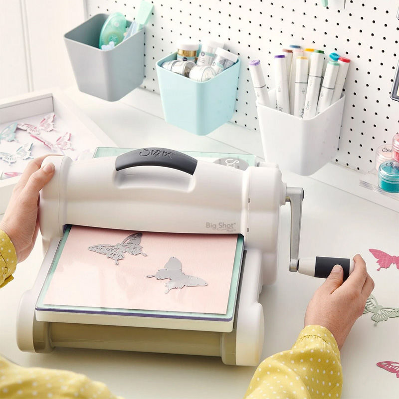 Die Sizzix Big Shot A4 schneidet mühelos durch alle Arten von Bastelmaterialien von Papier bis Filz. Diese Stanzmaschine ist sowohl für niedrige als hohe Stanzschablonen, wie z.B.Sizzix Bigz Dies geeignet. Neben dem Schneiden können Sie die Big Shot auch verwenden, um mit Prägeschablonen (Prägefoldern) einen schönen 3D Effekt zu erzielen. In beiden Fällen beginnen Sie mit der Plattform als Basis. Danach kommt die magnetische Schneide- oder Prägeplatte zum Einsatz. Als nächstes legen Sie Ihr ausgewähltes Material z.B. Papier auf die Platte und legen eine Schneideplatte darüber ODER Sie schieben das Papier zwischen eine Prägeschablone und legen es auf die Platte.