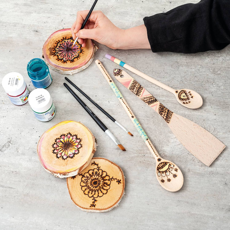 Brandmalerei war bereits in den 80ern ein Hit. Das verstaubte Image ist aber inzwischen abgelegt und der Brennkolben wieder ein begehrtes Stück. Der Brandmalkolben kommt gleich mit 8 unterschiedlichen Spitzen daher, mit denen sich unterschiedliche Musterungen ins Holz brennen lassen. Fertigen Sie damit einmalige Türschilder, Bieruntersetzer, Kleiderbügel oder Topflöffelunikate!