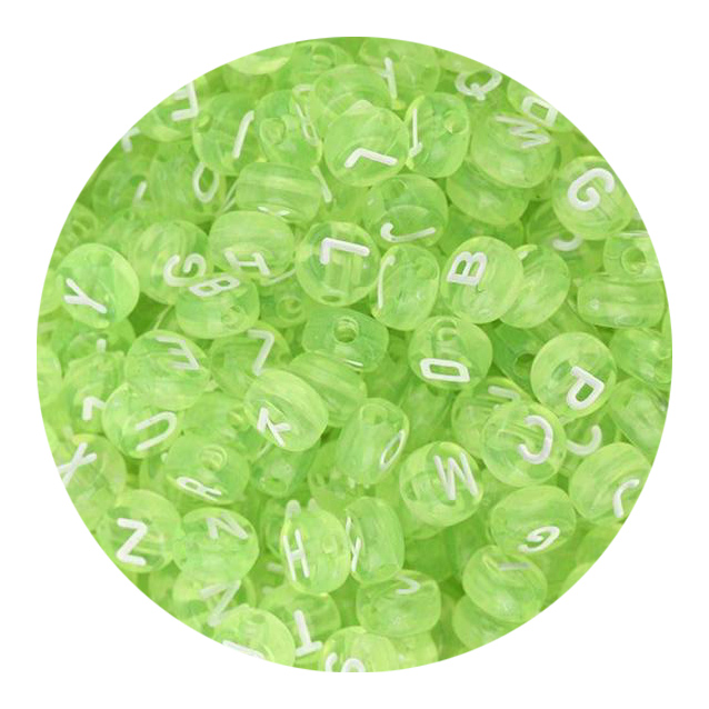 Buchstabenperlen hellgrün transparent mit weißer Schrift, ca. 4 x 7mm, Preis pro 100 Stück