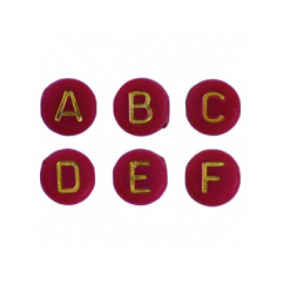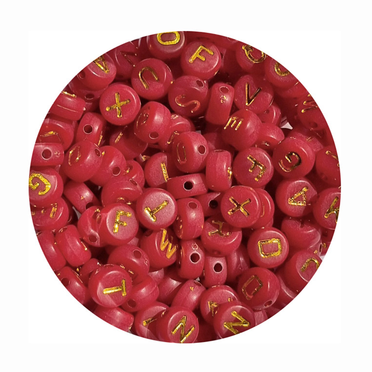 Buchstabenperlen dunkelrotrot opak mit goldener Schrift, ca. 4 x 7mm, Preis pro 100 Stück (ca. 13-15g)