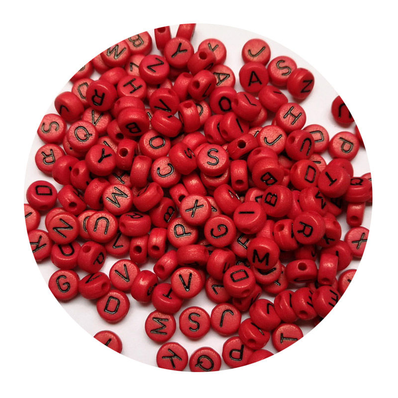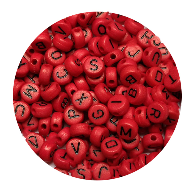 Buchstabenperlen rot opak mit schwarzer Schrift, ca. 4 x 7mm, Preis pro 100 Stück