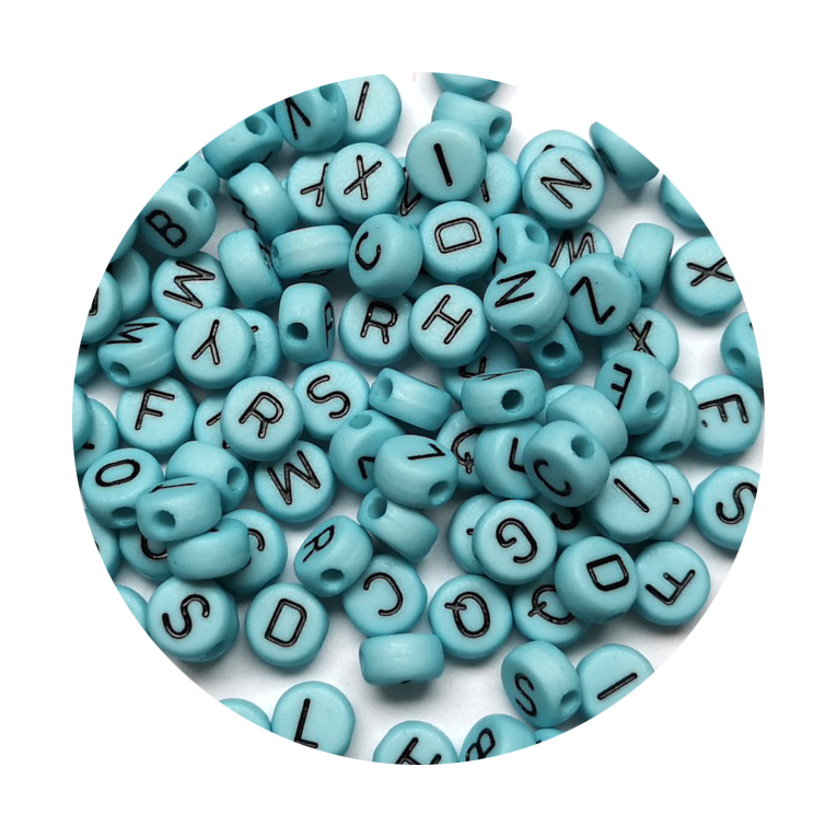 Buchstabenperlen helltürkis opak mit schwarzer Schrift, ca. 4 x 7mm, Preis pro 100 Stück