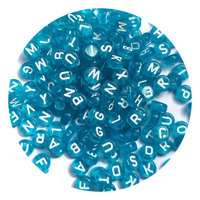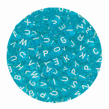 Buchstabenperlen türkis transparent mit weißer Schrift, ca. 4 x 7mm, Preis pro 100 Stück