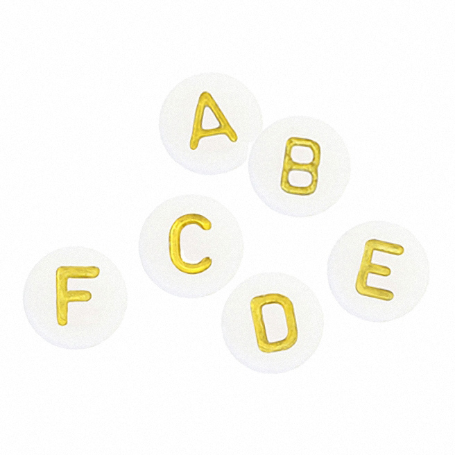 Zum Fertigen von farbenfrohen Namensarmbänder. Die Acrylperlen mit weißen Buchstaben sind der ideale Hingucker für Schnullerketten, Armbändchen, Schlüsselanhänger oder Namensketten. Die Perlen sind ca. 7mm im Durchmesser und 4mm stark. Die Bohrung ist für Fädelmaterial bis zu 1mm geeignet.