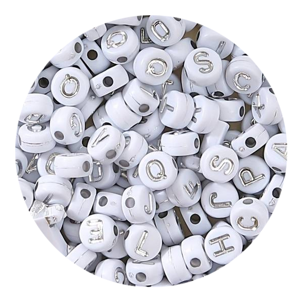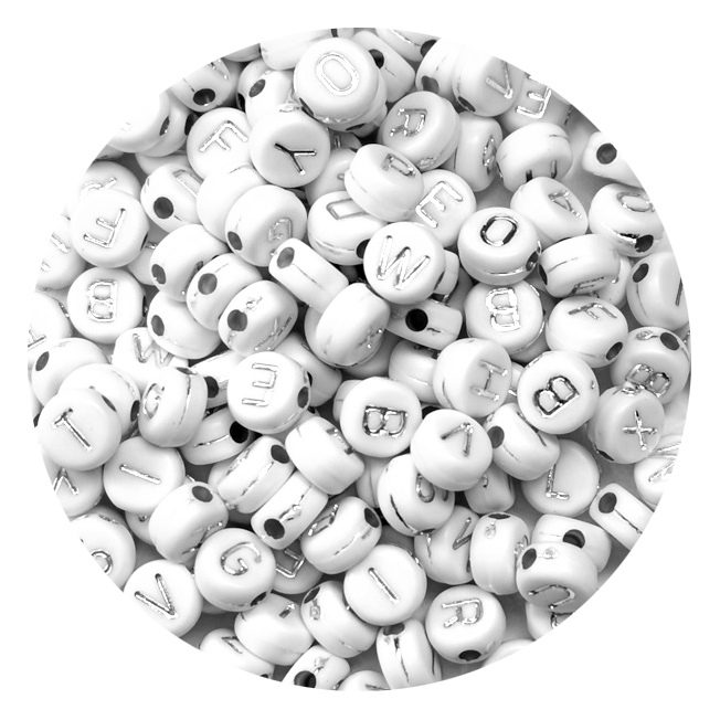 Buchstabenperlen weiß mit silberner Schrift, ca. 4 x 7mm, Preis pro 100 Stück
