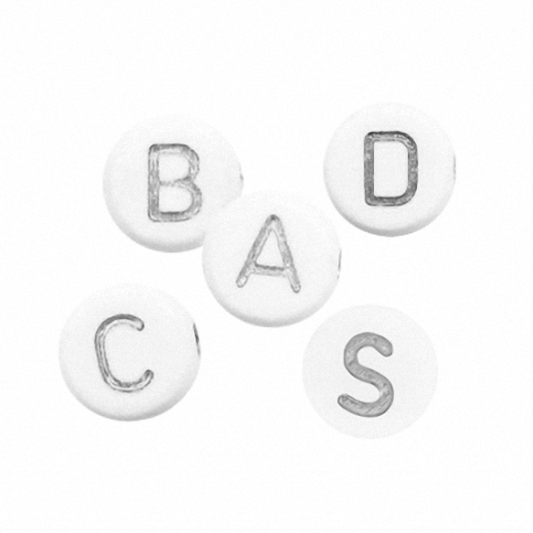 Zum Fertigen von farbenfrohen Namensarmbänder. Die Acrylperlen mit weißen Buchstaben sind der ideale Hingucker für Schnullerketten, Armbändchen, Schlüsselanhänger oder Namensketten. Die Perlen sind ca. 7mm im Durchmesser und 4mm stark. Die Bohrung ist für Fädelmaterial bis zu 1mm geeignet.