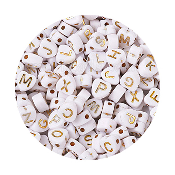 Buchstabenperlen Herz weiß mit goldener Schrift, ca. 4 x 7mm, Preis pro 100 Stück
