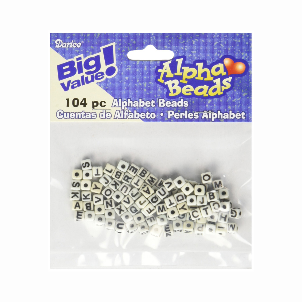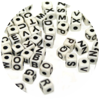 Buchstabenperlen in Würfelform, weiß mit schwarzer Schrift, ca. 5x5mm, quadratisch, Preis pro 104 Stück