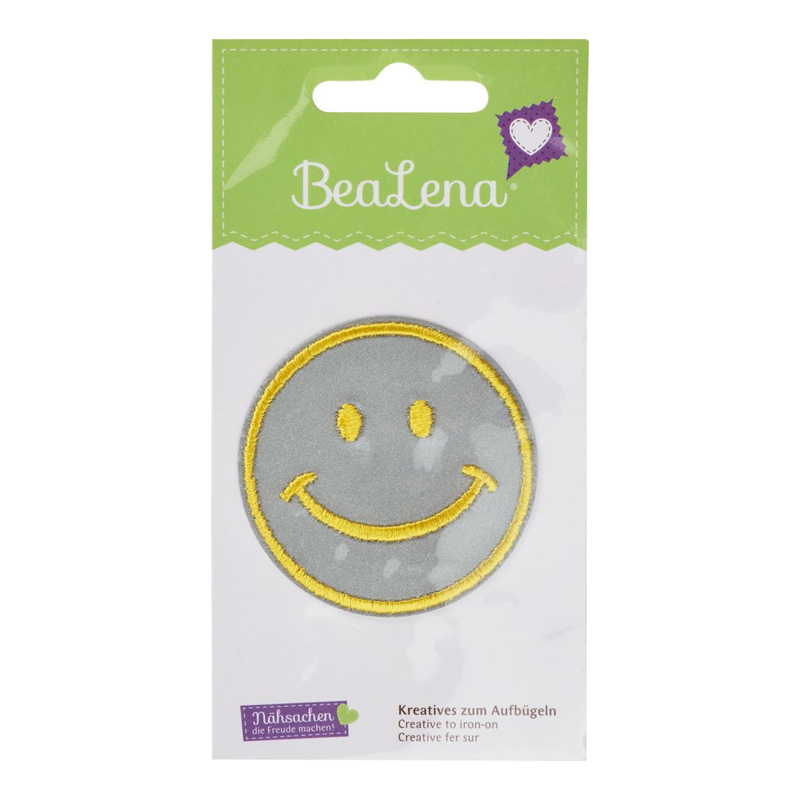 Coole Bügelapplikation mit reflektierendem "Smile"-Motiv – perfekt zum Aufpeppen, Verzieren oder Reparieren von Kleidung und Accessoires. Die Applikation ist einfach aufzubügeln und sorgt dank reflektierender Oberfläche für zusätzliche Sichtbarkeit.
