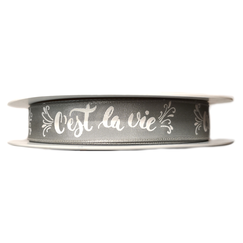 Dekoband mit Aufschrift "C'est la vie" (So ist das Leben), grau, ca. 15mm breit, Ripsband, Preis pro Meter