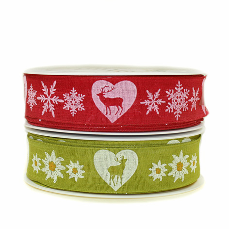 Dekoband mit Hirsch und Schneeflocke oder Edelweiß, in rot oder grün, 25mm breit, 100% Mischgewebe, Preis pro Meter