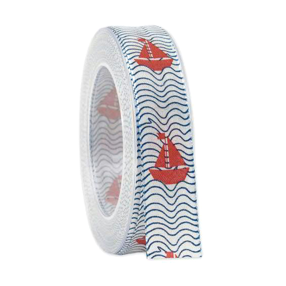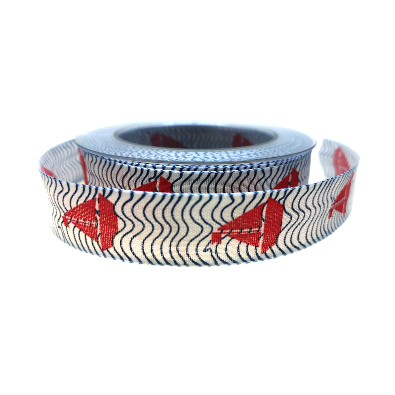 Rote Segelboote auf welligem Hintergrund sind hier Programm. Gerade für die maritime Dekoration ein wunderschönes Dekoband. Kombinieren Sie dazu Schwemmholz, Muscheln, Seesterne, Strandstühle und vieles mehr.