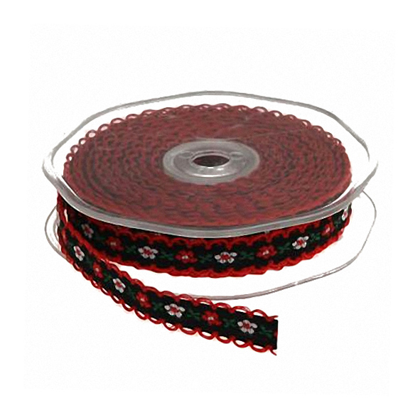 Diese süße Blümchenborte ist der Inbegriff vom Trachtenstil. Der Rand ist mit geklöppelter Spitze in Bogenform eingefasst und die Blümchen sind gewebt - also kein billiger Druck! Das Band ist aus 100% Polyester - sieht aber aus wie Baumwolle!