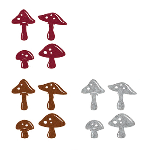 Diesen süßen Fliegenpilz gibt es in 4 Varianten. Die Pilze können aufgenäht, in Kränzen verarbeitet oder als Streuteil verwendet werden.