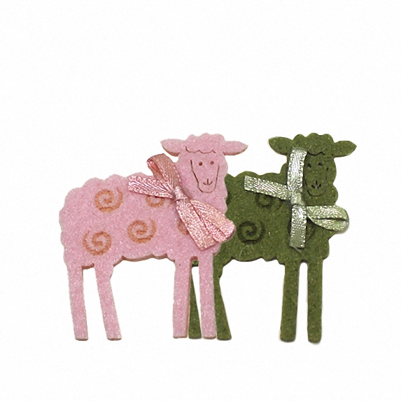 Filzlämmchen zum Streuen sind die idealen Motive an Ostern, Jedes Tierchen hat sein Schleifchen und kann auf Gegenstände oder Karten geklebt werden. Es handelt sich um 100% Polyesterfilz.