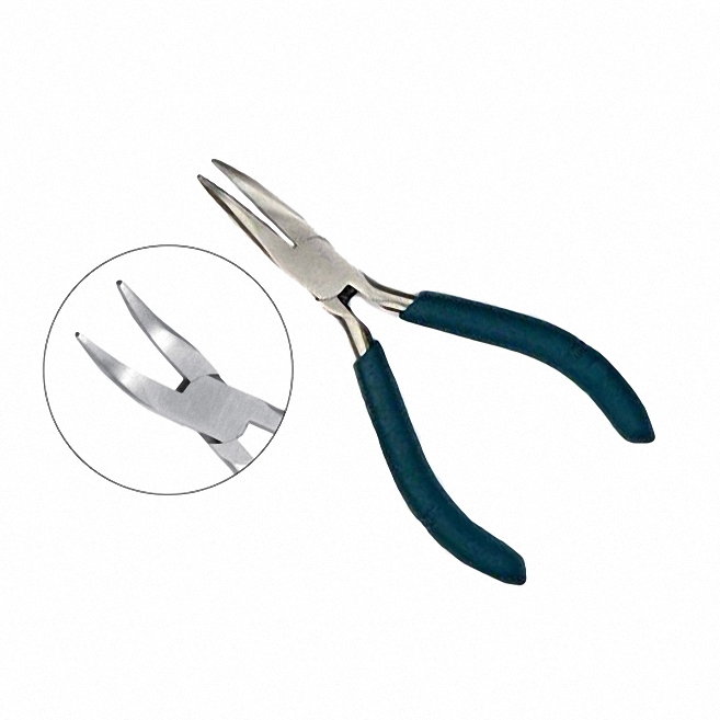 Die Zange ist vorne gebogen und erleichtert ein Arbeiten mit 2 Zangen. Es lässt sich damit enger zusammenarbeiten und Ösen öffnen etc. Die Biegung erleichtert auch das Halten der Zange, da man das Objekt in gerader Handhaltung vor sich hat. Auch Ringel und Perlen lassen sich damit leichter fassen.