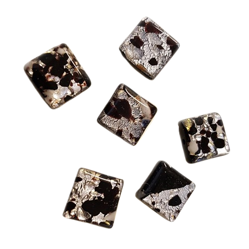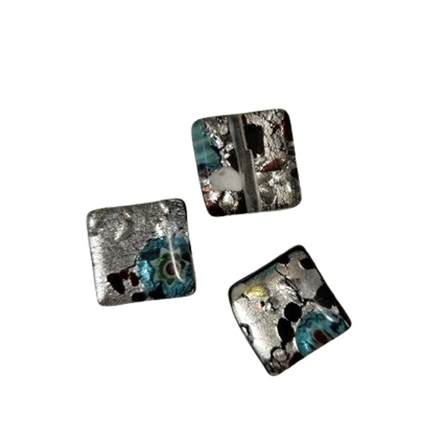 Dieses Glasquadrat hat es in sich. Unterlegt mit Silberfolie ist jedes Quadrat ein Unikat. Teilweise kann man ein Millefiorimuster erkennen und teilweise sind weitere Farben hinterlegt. Das Quadrat hat abgerundete Kanten und eine Bohrung von ca. 1-2mm.