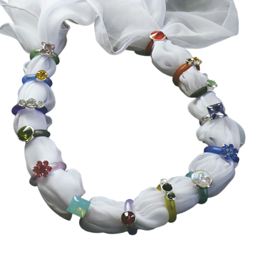 Zubehörteile für Michelle-Wechselringe. Es handelt sich um eine wunderschöne Kollektion mit vielen Varianten an Steckteilen und Kautschuk-Schläuchen. (PVC)