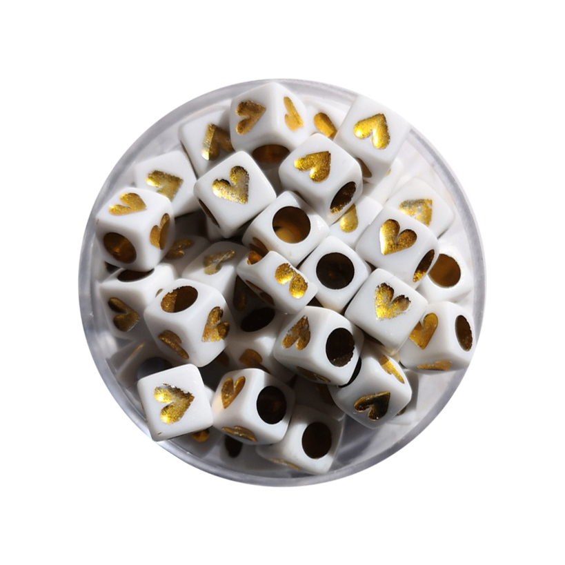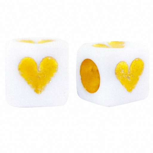Herzperlen in 7mm, weiß mit goldenem Herz, Würfelform, passend zu unseren Buchstabenperlen, Preis pro Stück