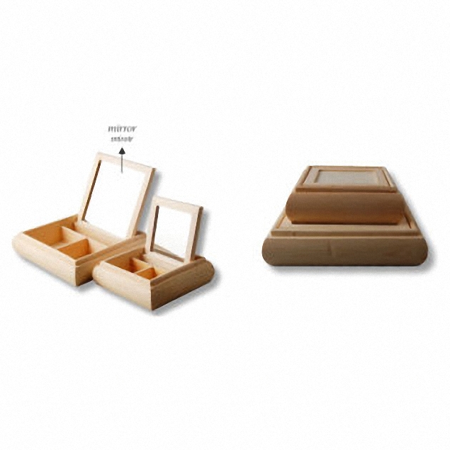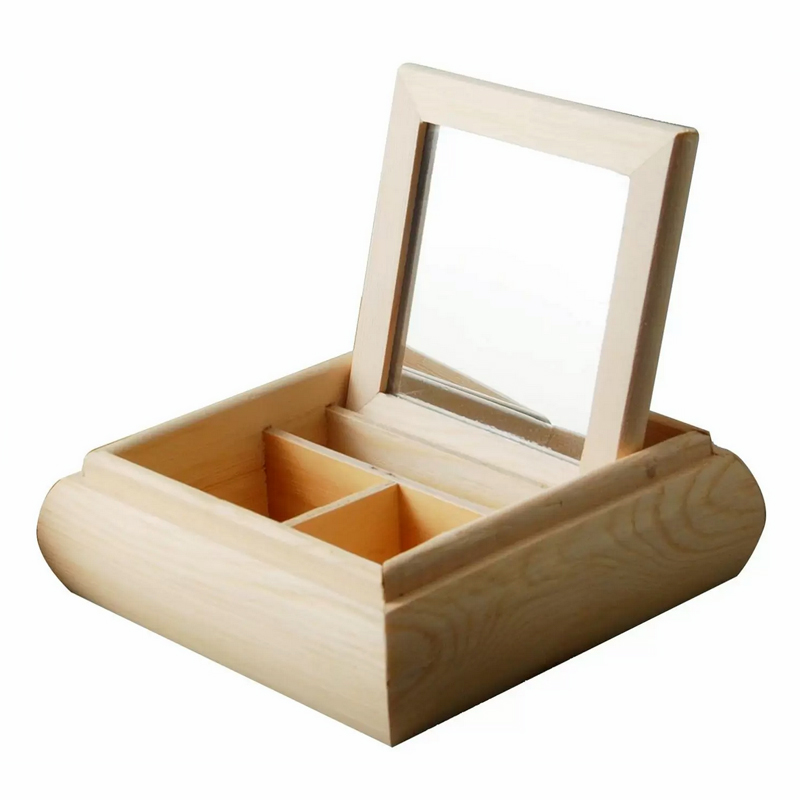 Die Holzdose kann als Schmink- oder Schmuckdose verwendet werden. Der Deckel lässt sich hochklappen und innen befindet sich ein Spiegel. Die Dose gibt es in 2 Größen. (Nur solange Vorrat reicht)