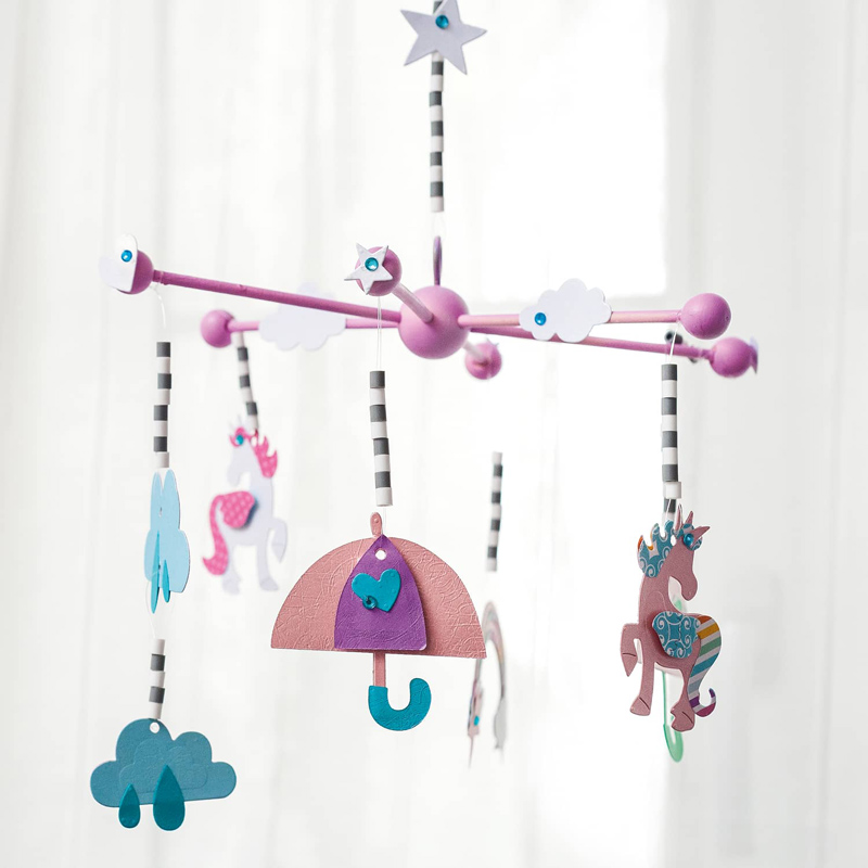 Bei dem Set handelt es sich um Holzstäbe mit Kugeln, die zu einem Stern zusammengesteckt werden können. Daran lassen sich dann Tiere, Figuren, Blumen oder andere Gegenstände anbringen. Ein Mobile dient zur Unterhaltung des Babys beim Einschlafen, wickeln oder einfach als Beschäftigung.