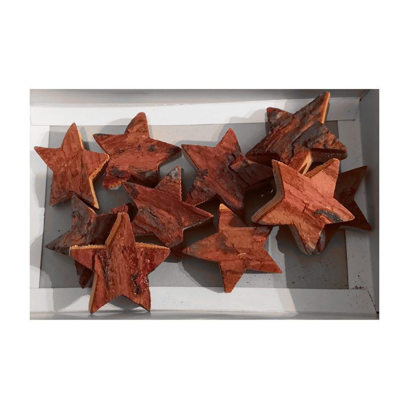 Hübsche Rindensterne mit Holz in der Größe von ca. 4cm. Die Sterne sind ca. 1cm stark und werden als 10er Pack verkauft. Ideal für Adventskränze oder Gestecke oder einfach als Tischdeko zum Streuen