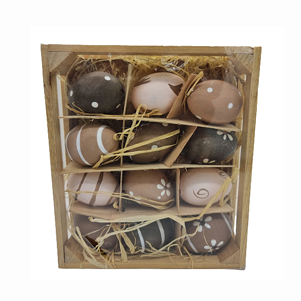Wirklich wunderschöne Ostereier aus Keramik gefertigt. Die Eier sind mit einem Muster bemalt und matt gehalten. Das Ganze kommt im praktischen Holzkörbchen.