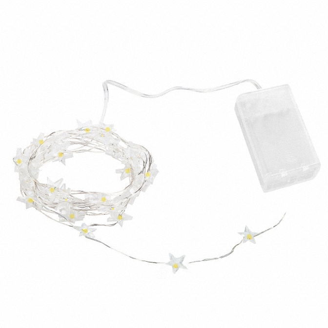 Praktische Microlichterkette mit trasparentem Kabel und 20 LED's. Ein kleines Batteriefach mit 2x AA Batterien reicht, um die Kette unabhängig von der Stromquelle leuchten zu lassen. (Batterien nicht enthalten)