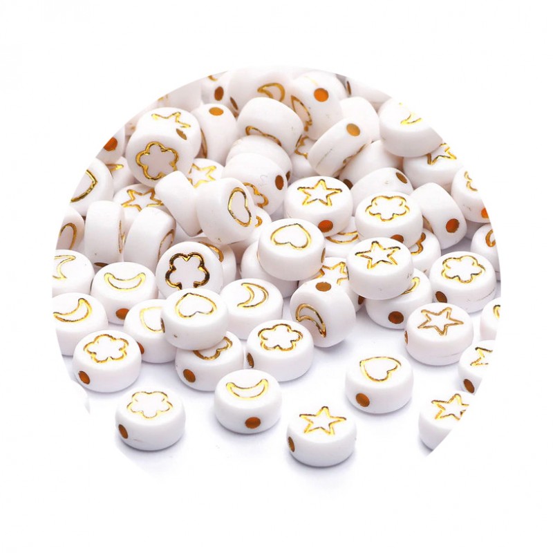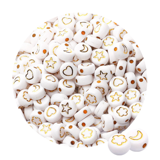 Stern-, Mond-, Herz- und Blumenperlen in 7mm, weiß mit gold, passend zu unseren Buchstabenperlen, Preis pro Stück