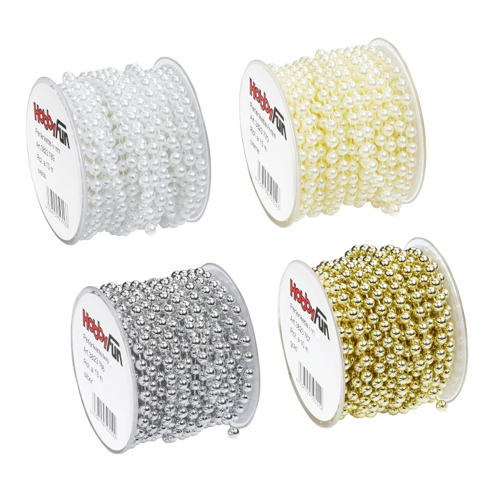 Wer kennt sie nicht, die Perlenkette zum Verzieren von Geschenken, an Kränzen oder am Weihnachtsbaum? Dias Perlenband gibt es in 4 Farben und 3 Größen. Die Verwendung ist schier unendlich. Die einzelnen Perlen sind exakt auf einer Schnur angebracht und verrutschen nicht. Sie lässt sich daher bestens kürzen.