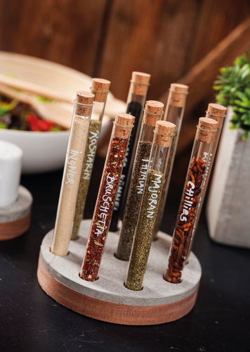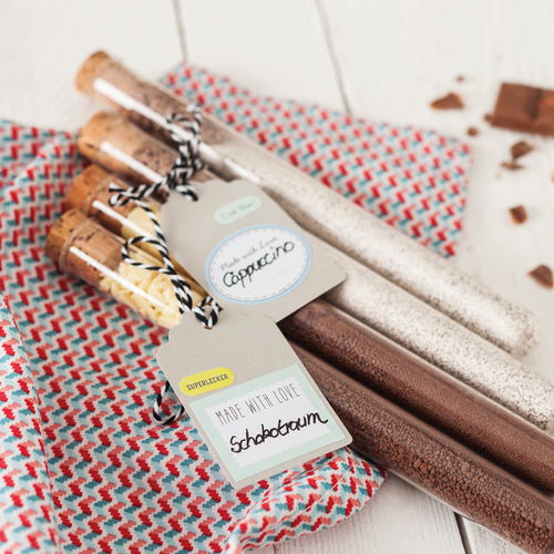 Reagenzgläser sind vielfältig einsetzbar. Man kann Sie mit allem Möglichen befüllen und mit schönen Schleifen verzieren. Selbstgetrocknete Kräuter, Salze, Pfeffer, Perlen, Glitzer oder Essig & Öl.
