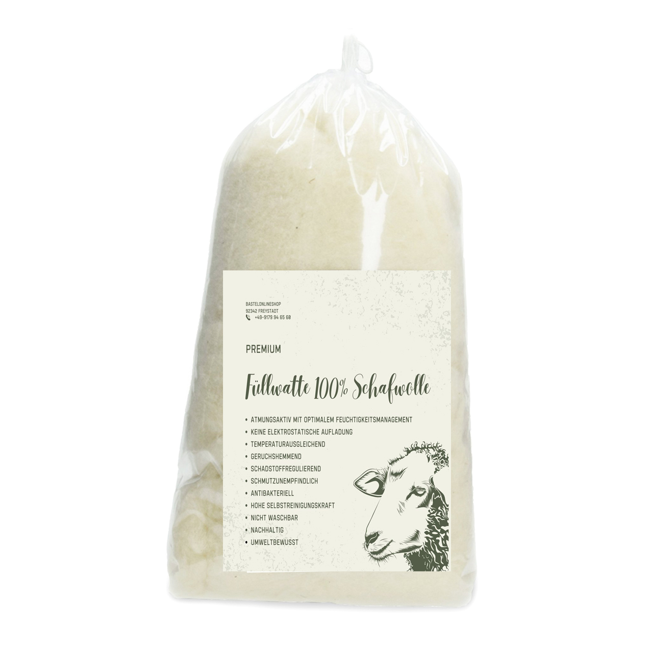 Füllwatte aus 100% Schafwolle. Ideal geeignet für alle hochwertigen Bastelarbeiten. Stofftiere lassen sich damit besonders gut stopfen, bzw. wieder auffüllen und Kissen gut befüllen.