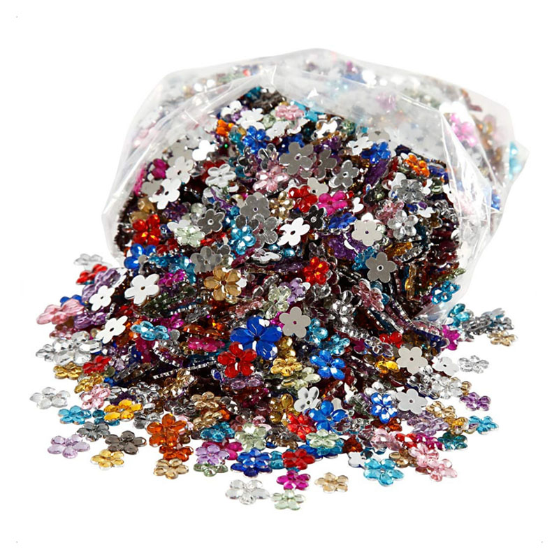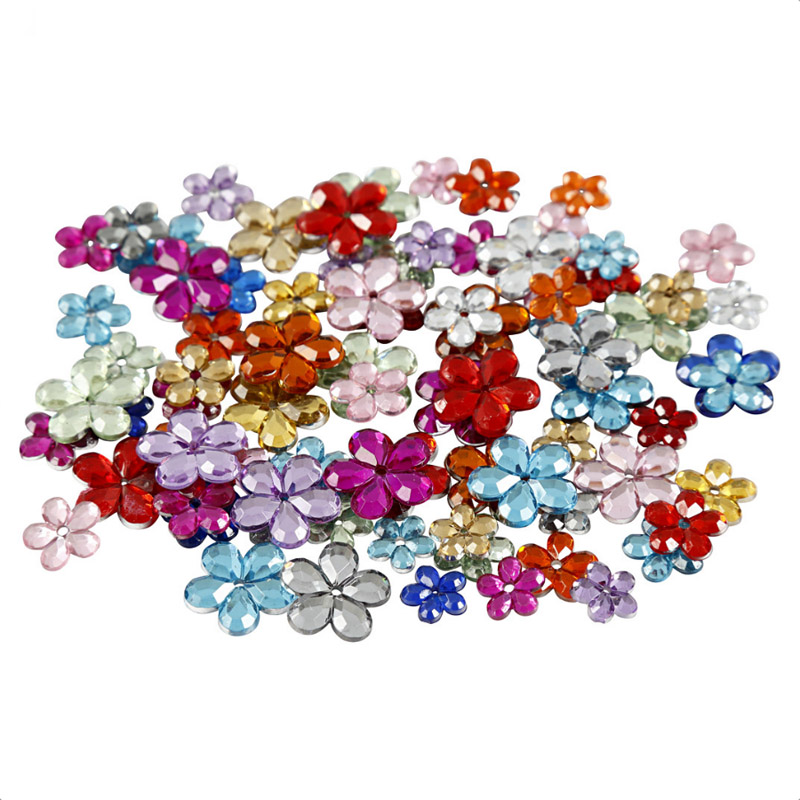 Diese Blumen sind aus Acryl und die Blüten wie geschliffene Kristalle gefertigt. Jeder kennt sie unter dem Begriff "Schmucksteine". Die Rückseite ist silber foliert, damit die Vorderseite wunderschön funkelt. Die Blumen habe alle ein Fädelloch, sodass man sie auch auffädeln könnte. In den meisten Fällen werden sie aber auf Gegenstände oder in Karten geklebt. Aber auch Bilderrahmen und ähnliches lassen sich damit verzieren. Die Farben kommen bunt gemischt daher....