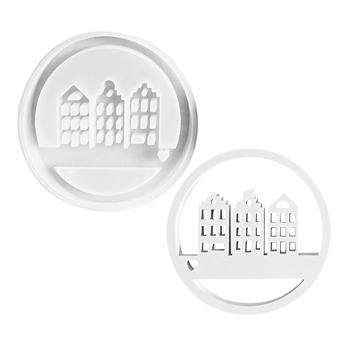 Gießform aus Silikon für Keraflott, Kerzen oder Seife, 3 alte Häuser mit Ring und Herz