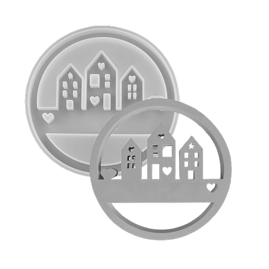 Gießform aus Silikon für Keraflott, Kerzen oder Seife, 3 Häuser mit Ring und Herzen