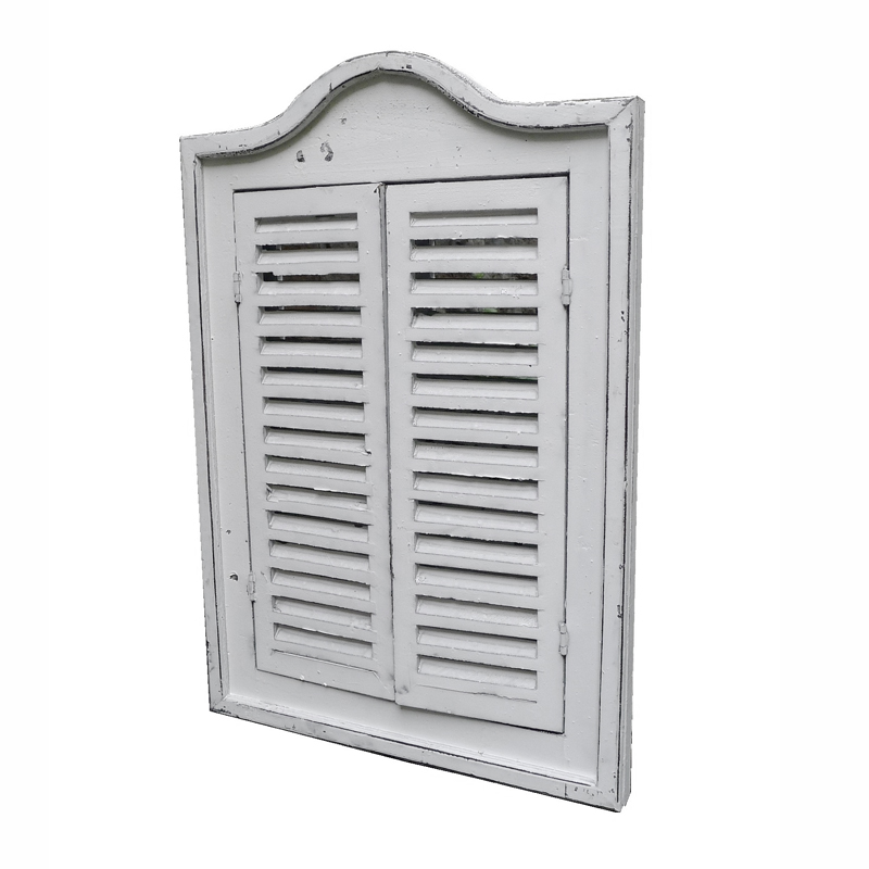 - Design: Aufklappbare Fensterläden mit Lamellen aus Holz, die dem Spiegel eine Fenster-Optik verleihen