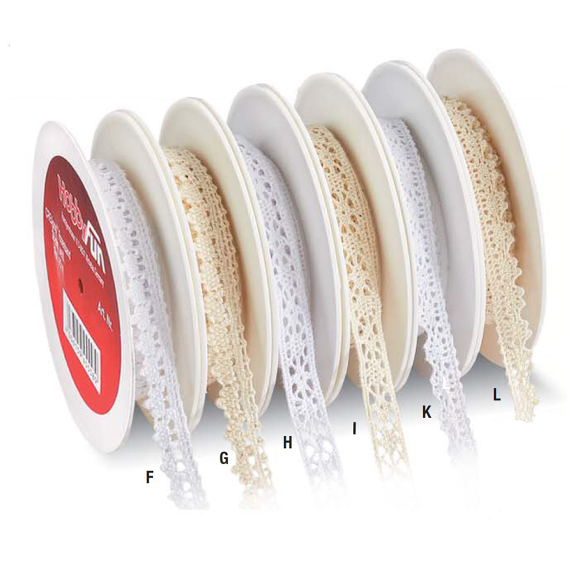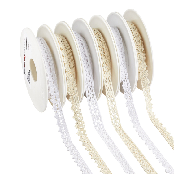 Dekoband Spitzenborte in 3 Designs in je 2 Farben, 10-13mm Breite, Preis pro 10m Rolle