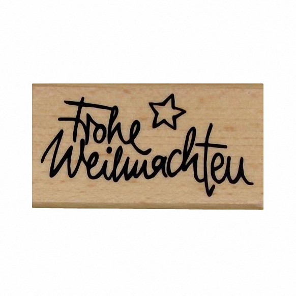 Der Stempel mit der Aufschrift Frohe Weihnachten ist in einer schwungvollen Handschrift gefertigt und ein kleines Sternchen prangt auch noch daneben. Für die Kartengestaltung an Weihnachten unverzichtbar.