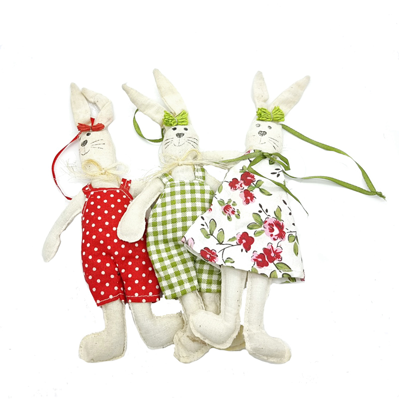 Die Stoffhäschen sind adrett gekleidet und mit einem Satinband zum Aufhängern versehen. Die Hasen sind leicht mit Füllwatte wattiert. Sier erhalten 1 Set mit 3 Hasen. (Tilda Style)