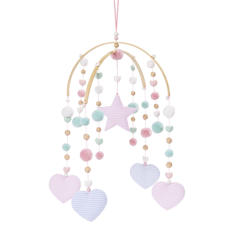 Die Stoffherzen sind mit Füllwatte ausgestopft und haben ein Loch zum Aufhängen. Die Herzen gibt es in rosa oder hellblau gestreift. Ein wirklich hübsches Highlight für Mobilés oder Kinderwagenketten.