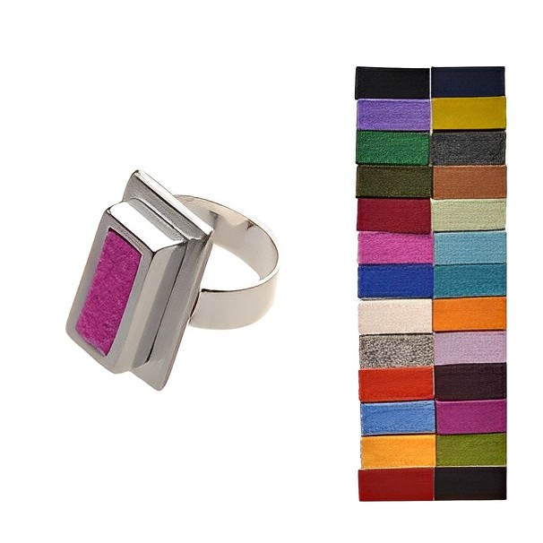 Eleganter Wechselschmuck für jeden Anlass! Dieser einzigartige Ring aus hochwertigem Aluminium ist mit 26 austauschbaren Wollfilzeinlagen in 15x30mm ausgestattet. Der Ring misst insgesamt 20x35mm und lässt sich individuell verstellen, um sich verschiedenen Fingergrößen anzupassen. Hergestellt in Deutschland, überzeugt dieser Ring durch präzise Verarbeitung und stilvolle Vielseitigkeit. Wählen Sie für jedes Outfit die perfekte Farbe und setzen Sie modische Akzente – ein Accessoire, das Stil und Flexibilität vereint! Je nach Outfit oder Stimmung einfach die Farbe austauschen!