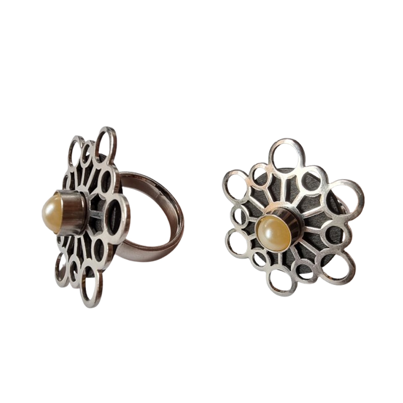 Das Schmuckstück besticht durch seine elegante Silberscheibe (ähnlich eines Atoms), die einen glänzenden, edlen Akzent setzt. Darunter liegt eine zweite Scheibe in Schwarz, die durch ihren Kontrast Tiefe und eine dezente Dramatik ins Design bringt. Diese Kombination aus Schwarz und Silber verleiht dem Ring eine zeitlose und vielseitige Ästhetik.